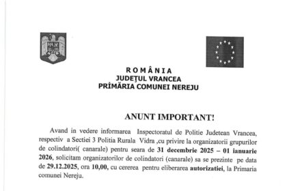 ANUNȚ PUBLIC Primăria Comunei Nereju informează cetățenii că în zilele de joi,…